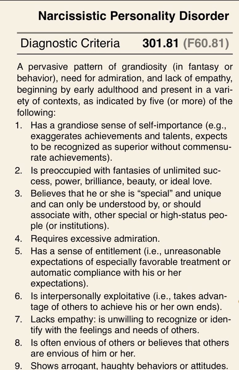 In any event, once again, here are the actual clinical diagnostic criteria from the DSM for Narcissistic Personality Disorder (5 of 9 needed) ...