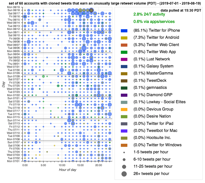 @nationaIIy @pixeIise @morelove @lotives @ZellaQuixote @HornyFacts Combined tweet schedule for all 60 of the tweet-cloning accounts as of 15:00 PDT. It mostly looks organic, but we do see some automated activity via "Hollywood Digital" in the previous hour. Did we tune in at the very moment these accounts became bots?