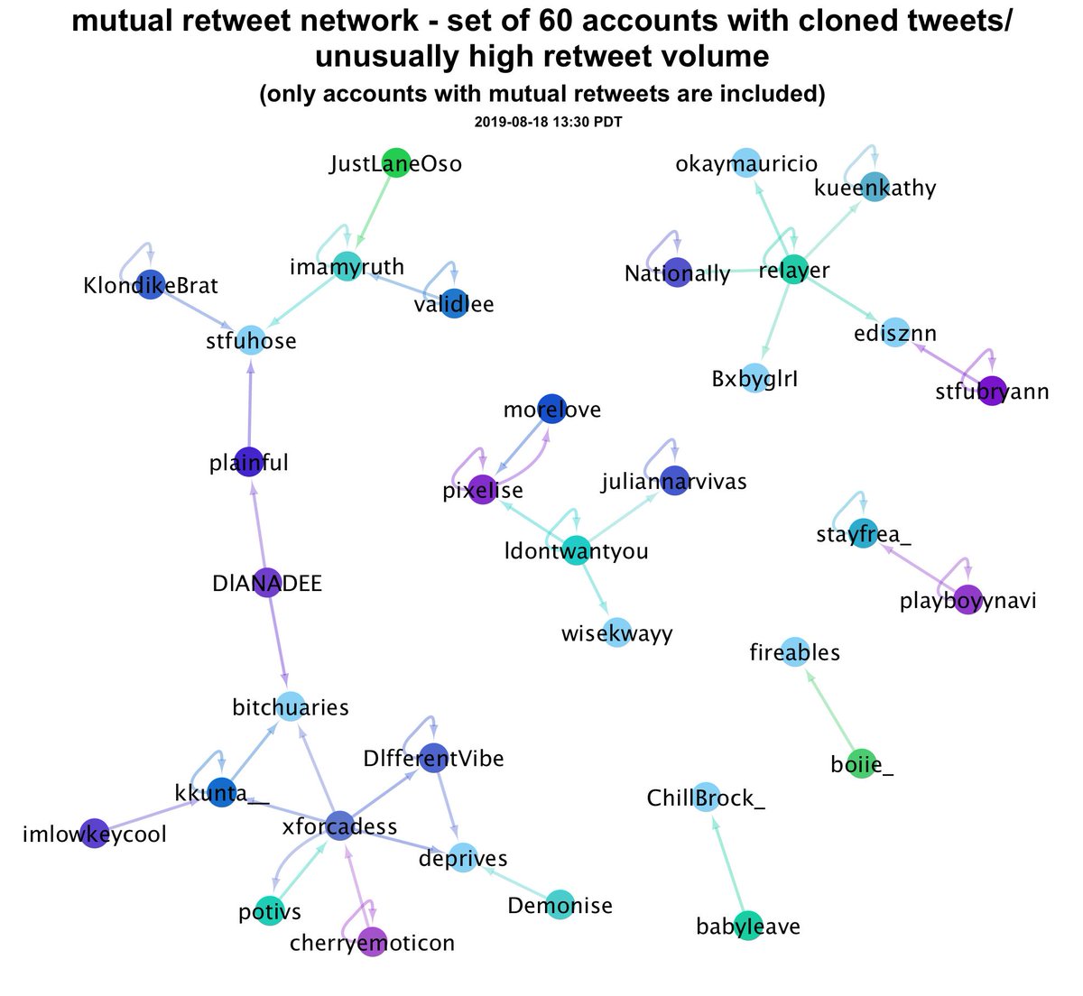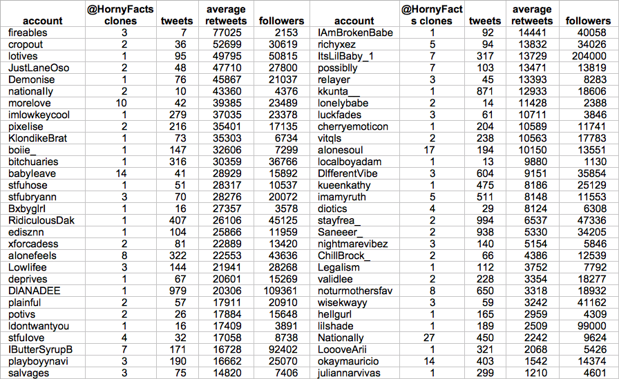 @nationaIIy @pixeIise @morelove @lotives @ZellaQuixote @HornyFacts Footnote: Although we can't be certain of how this network operates, tweetdecking seems likely - the disproportionate retweet volume on tweets from relatively obscure accounts and the use of plagiarized tweets are hints in that direction.