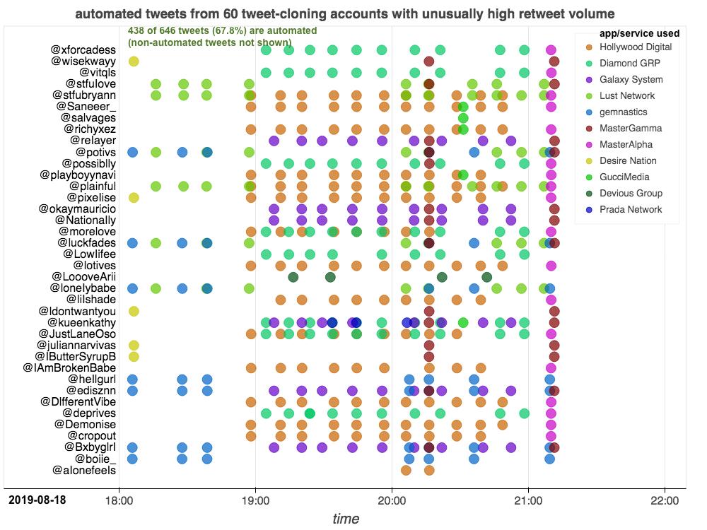 @nationaIIy @pixeIise @morelove @lotives @ZellaQuixote @HornyFacts The answer is a bit more complicated. We noticed earlier that several of the accounts undid automated retweets sent via MasterAlpha, and the same thing happened with the Hollywood Digital tweets. The accounts post automated RTs via a variety of apps and remove them shortly after.