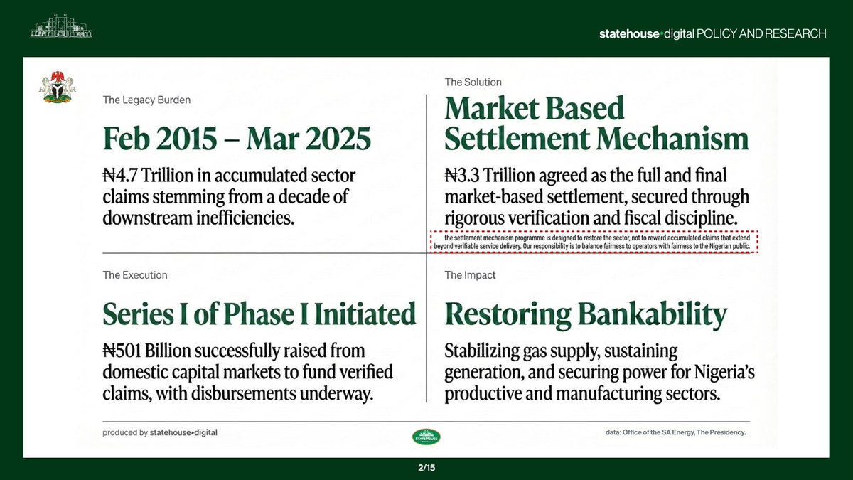 The Federal Government of Nigeria is implementing a structured and balanced reform programme to address longstanding financial challenges in the power sector. At the core of this effort is a market-based settlement mechanism designed to restore the sector, not reward accumulated claims that extend beyond verifiable service delivery. The objective is to ensure fairness to operators while also protecting the interest of the Nigerian public.