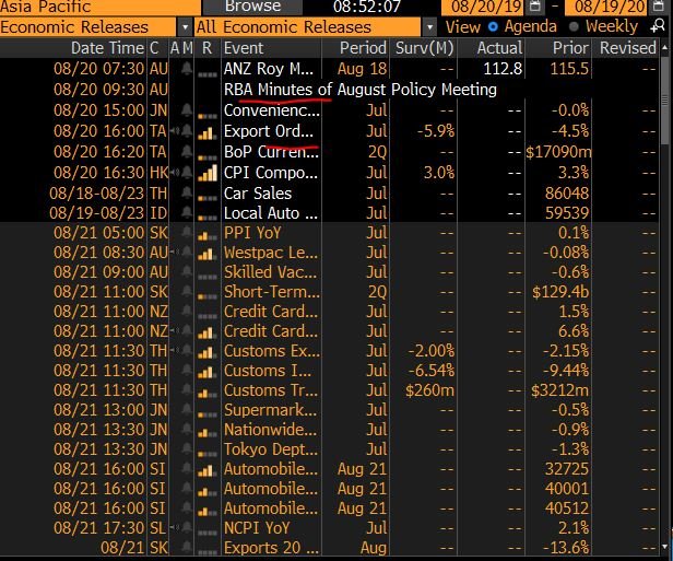 Busy morning! RBA minutes at 930 after China data. AUD has been trending back to the level of the day where RBNZ slashed rates by 50bps. Not a coincidence. Taiwan export orders out today & expectations are WORSE of -5.9% for July. But we all know that Korea is really the key data