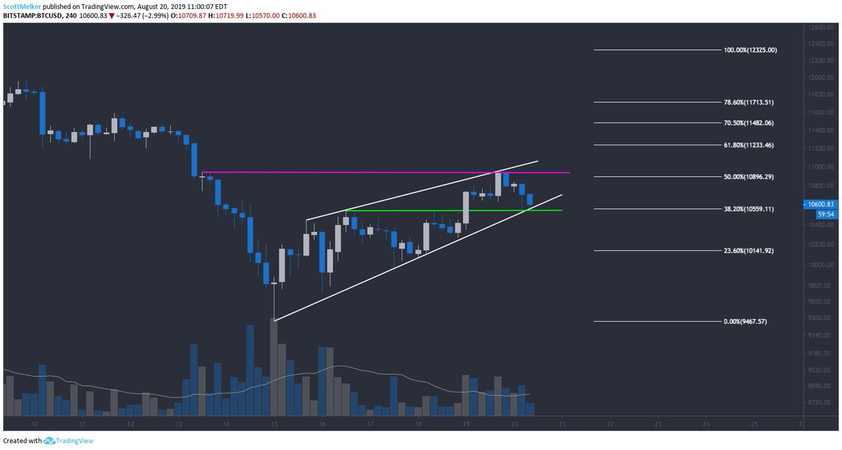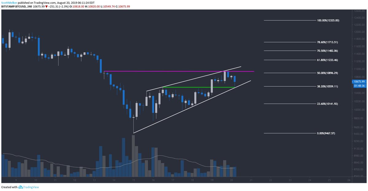 (1) Current low time frame view. Price rejected at confluence of horizontal resistance and the top of the rising wedge. Bitcoin has a tendency to destroy these "bearish patterns" to the upside. Remaining optimistic above the green line and bottom of wedge.