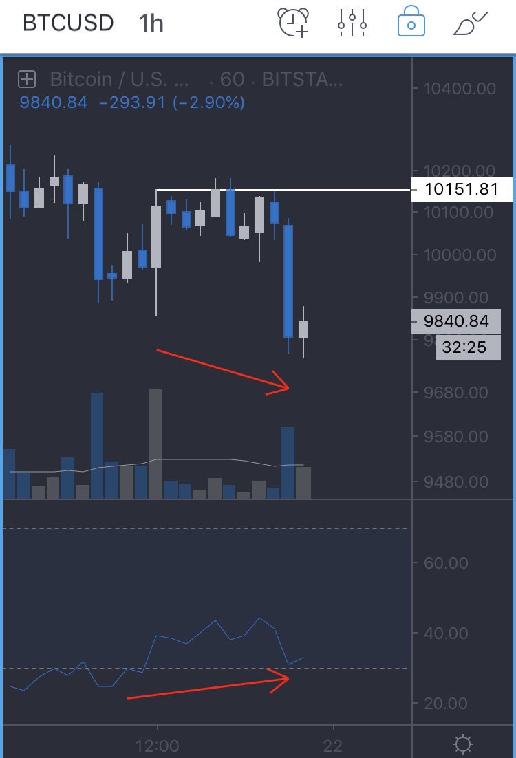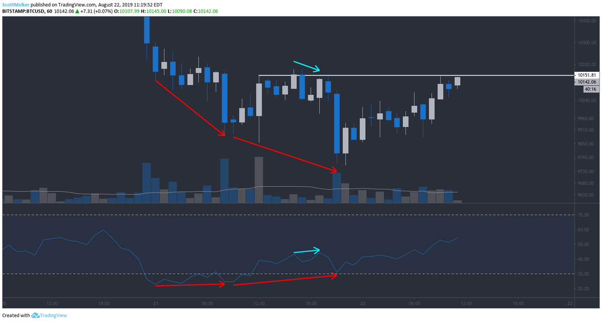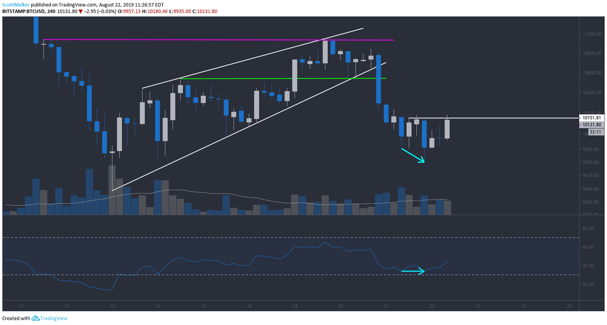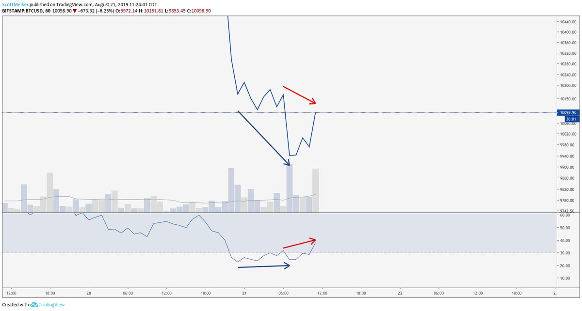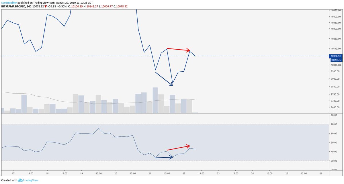 (3) Divs are stronger when RSI is overbought or oversold. 4 hour is my favorite time frame for div trading on $BTC. Notice, there was a small bullish divergence on the 4 hour chart, in confluence with the oversold hourly div I shared. That was as reliable a bounce sign as any.