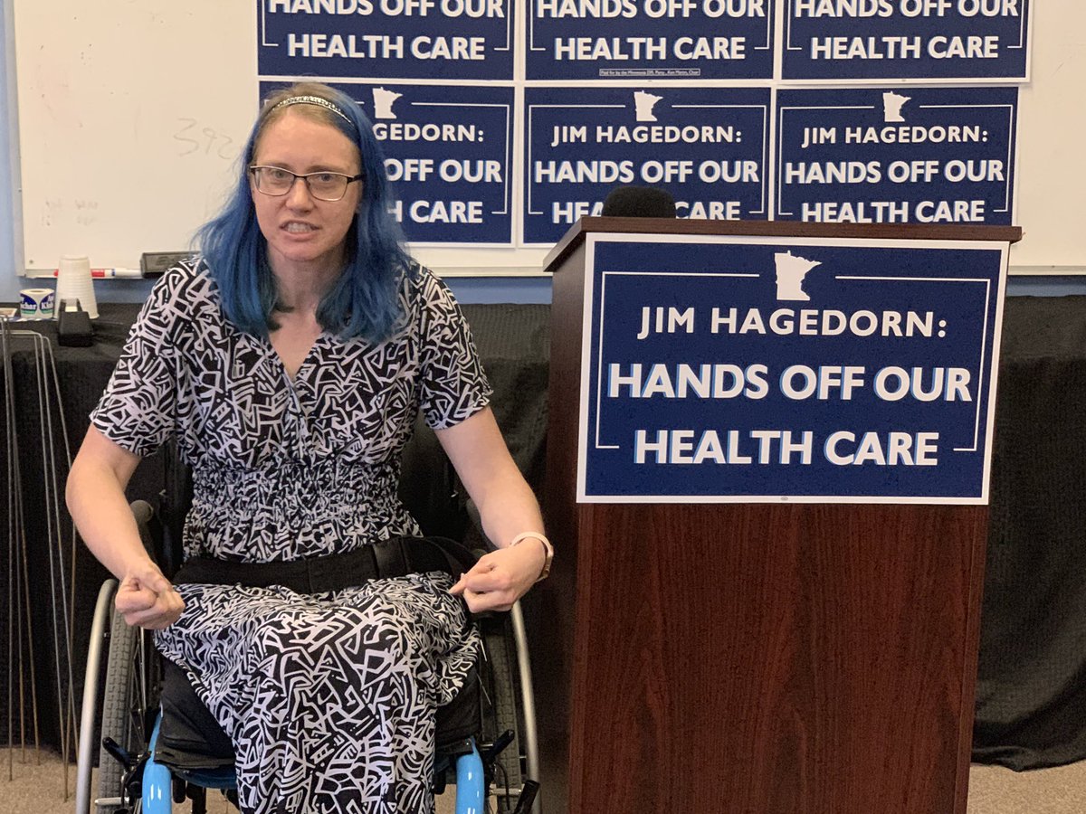 In Winona, Caitlin Nicholsen, who was left paralyzed from a terrible car accident, shares her concern that Jim Hagedorn’s health care agenda will leave her susceptible to the health insurance industry’s profit motives. She says to Hagedorn “Hands off my health care” #mn01 Image