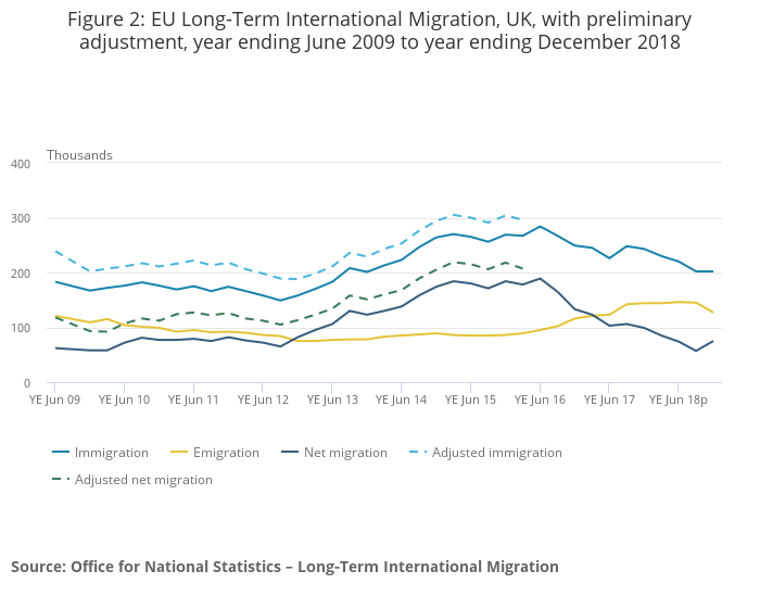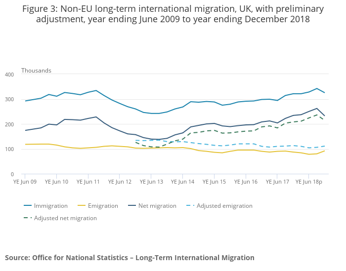 ONS has also concluded estimates of non-EU net migration have been too high, due to undercount of emigration of non-EU students. Adjusted figures non-EU net migration are 13% (or 25,000) lower than previous estimates in the year ending March 2016, and 8% or 18,000 lower for 2018.