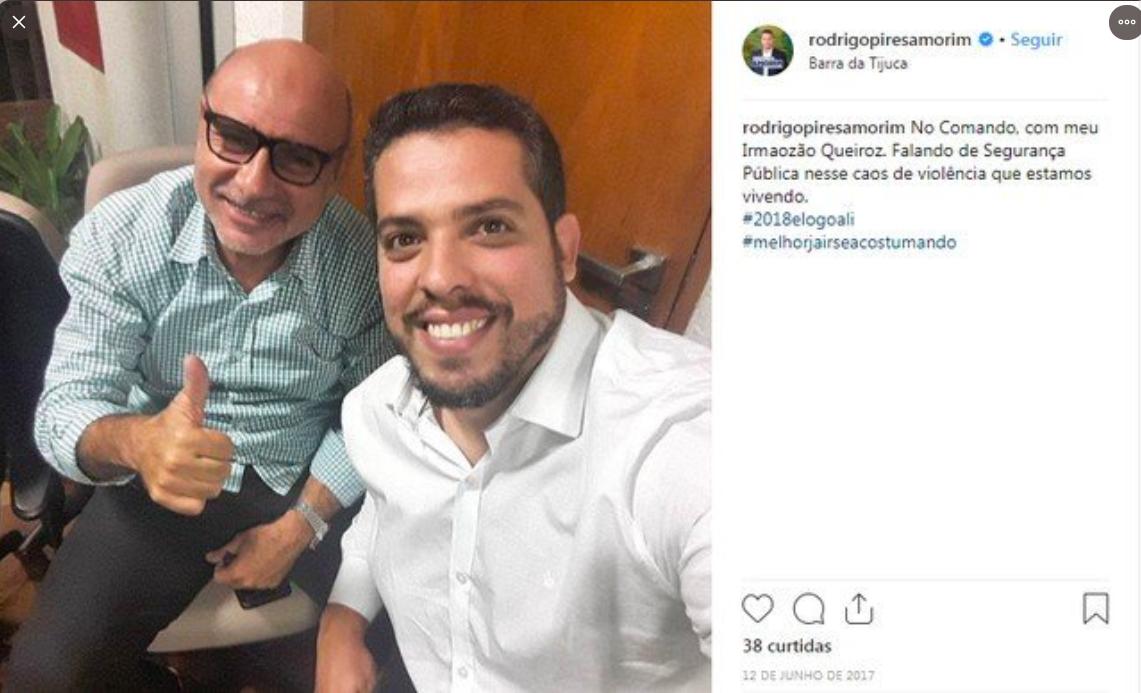 "Antigo": Junho de 2017. Rsrs. E não é só uma foto aleatória com Queiroz. Vc o chamou de seu "Irmaozão". Que vc tem orgulho de sua amizade - irmandade - com um miliciano e criminoso é o ponto. Vc sabe onde esta seu "Irmaozão"? A polícia está procurando por ele, supostamente.