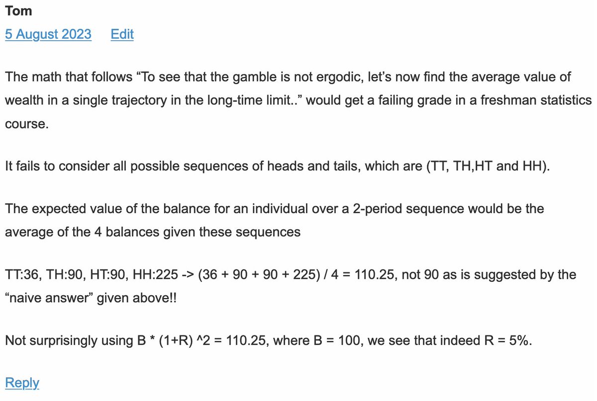 Why? Because utility is not usually an ergodic quantity in the mathematical models used by economists, and maximizing its expected value doesn't mean much in the real world. Image