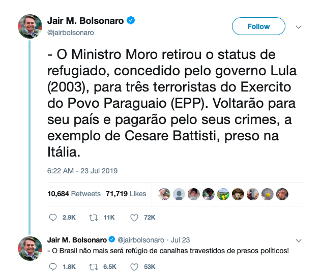6. Quando Bolsonaro se elegeu, surgiu uma nova chance. No dia seguinte à eleição, @MaritoAbdo disse que pediria a revogação do refúgio dos paraguaios. Antes de o processo ser aberto, Bolsonaro sinalizou que os entregaria, afirmando que o Brasil não daria “asilo a terroristas”.