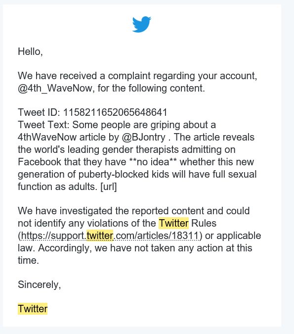 Unsuccessful attempt to muzzle us for (as usual) reporting facts: This time, because we posted a link to an article wherein we see gender specialists admit they don't know whether puberty-blocked kids will have full sexual function as adults. #NiceTry