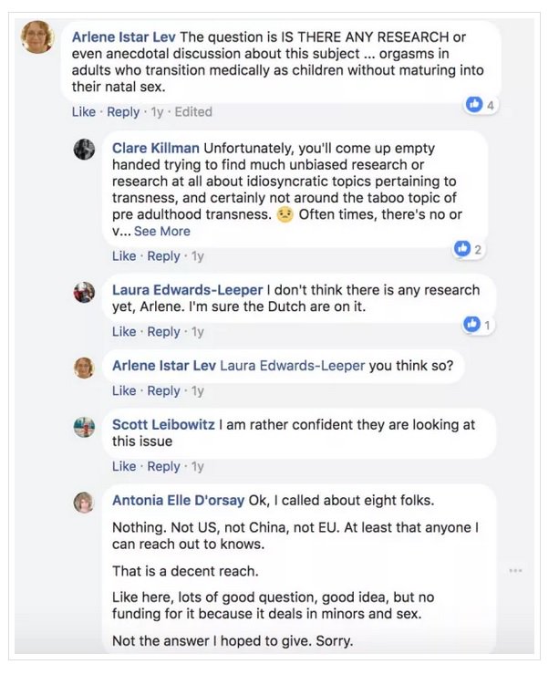 And here are the clinicians and activists, openly talking on a public Facebook page, about the lack of knowledge on the subject of future adult sexual function in puberty-blocked kids: facebook.com/groups/transge…