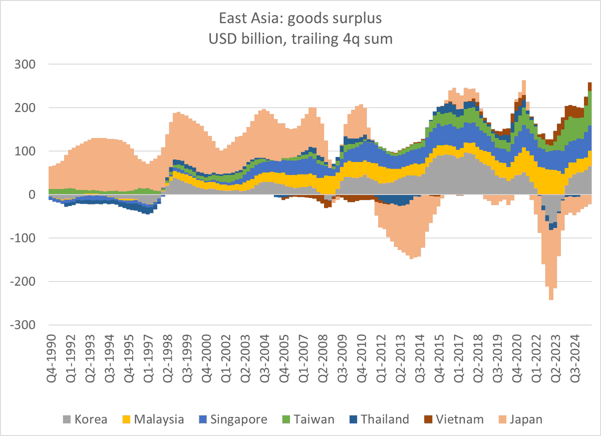 One feature of today's global economy: the incredible concentration of the global goods surplus in East Asia (using customs data). Way more so than in Trump one