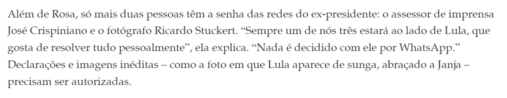 Primeiro, afirma que “𝐑𝐨𝐬𝐚 𝐟𝐚𝐳 𝐭𝐮𝐝𝐨 𝐪𝐮𝐞 𝐞𝐬𝐭𝐚́ 𝐚𝐨 𝐬𝐞𝐮 𝐚𝐥𝐜𝐚𝐧𝐜𝐞 𝐩𝐚𝐫𝐚 𝐚𝐮𝐦𝐞𝐧𝐭𝐚𝐫 𝐚 𝐢𝐧𝐟𝐥𝐮𝐞̂𝐧𝐜𝐢𝐚 𝐝𝐞 𝐋𝐮𝐥𝐚 𝐧𝐚𝐬 𝐫𝐞𝐝𝐞𝐬”. Depois, fala sobre uma das estratégias: “seguir, curtir e trocar mensagens com personagens que têm grande presença nas redes”. E continua: foi assim que Lula se tornou amigo virtual de ex-BBBs como 𝐉𝐮𝐥𝐢𝐞𝐭𝐭𝐞 e 𝐆𝐢𝐥 𝐝𝐨 𝐕𝐢𝐠𝐨𝐫. 𝐆𝐢𝐥 𝐟𝐚𝐳 𝐩𝐚𝐫𝐭𝐞 𝐝𝐨 “𝐬𝐪𝐮𝐚𝐝” 𝐝𝐚 𝐌𝐲𝐧𝐝𝟖.