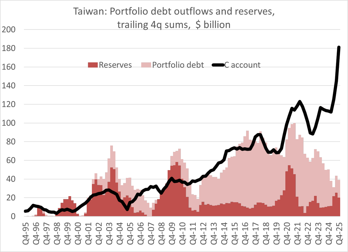And there is of course a capital flows story -- as the TWD depreciated in q4 in the face of this massive surplus (2x its level in 24), and Taiwan technically sold reserves too!