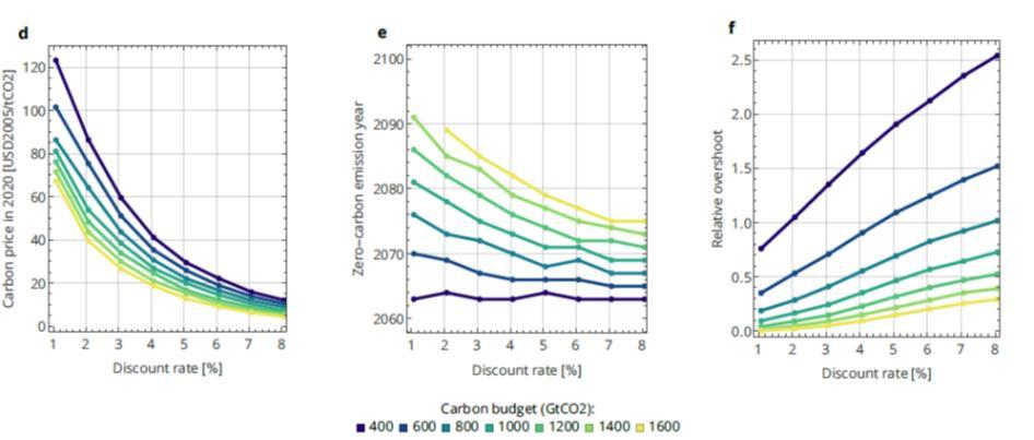 For a 1000 GtCO₂ carbon budget (~2°C), reducing the discount rate from 5% to 2% would more than double today's carbon price (from 21 to 55$/tCO₂), but halve the carbon budget overshoot & reduce net negative emissions by ~300GtCO₂...