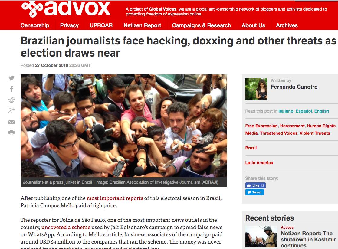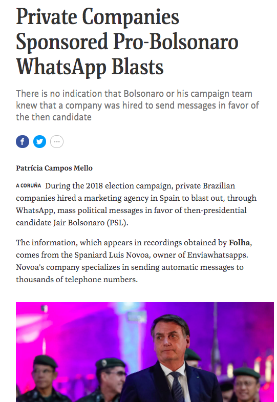 Also notable: this award is also going to an amazing reporter, @camposmello of @folha, who broke the biggest story of the 2018 election: how the Bolsonaro campaign was fueled by illegal, secret funds from oligarchs for WhatsApp messaging. She was threatened & harassed for months: