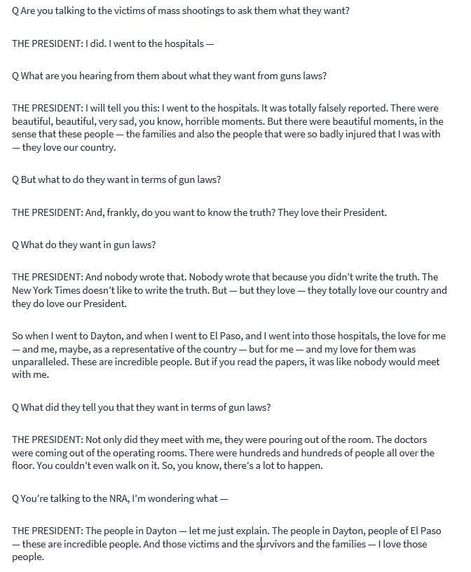 It's also worth noting the context in which Trump made this claim. He was asked what he's hearing about gun laws from victims of mass shootings; he didn't respond at all, instead choosing to boast about how he was received at hospitals.