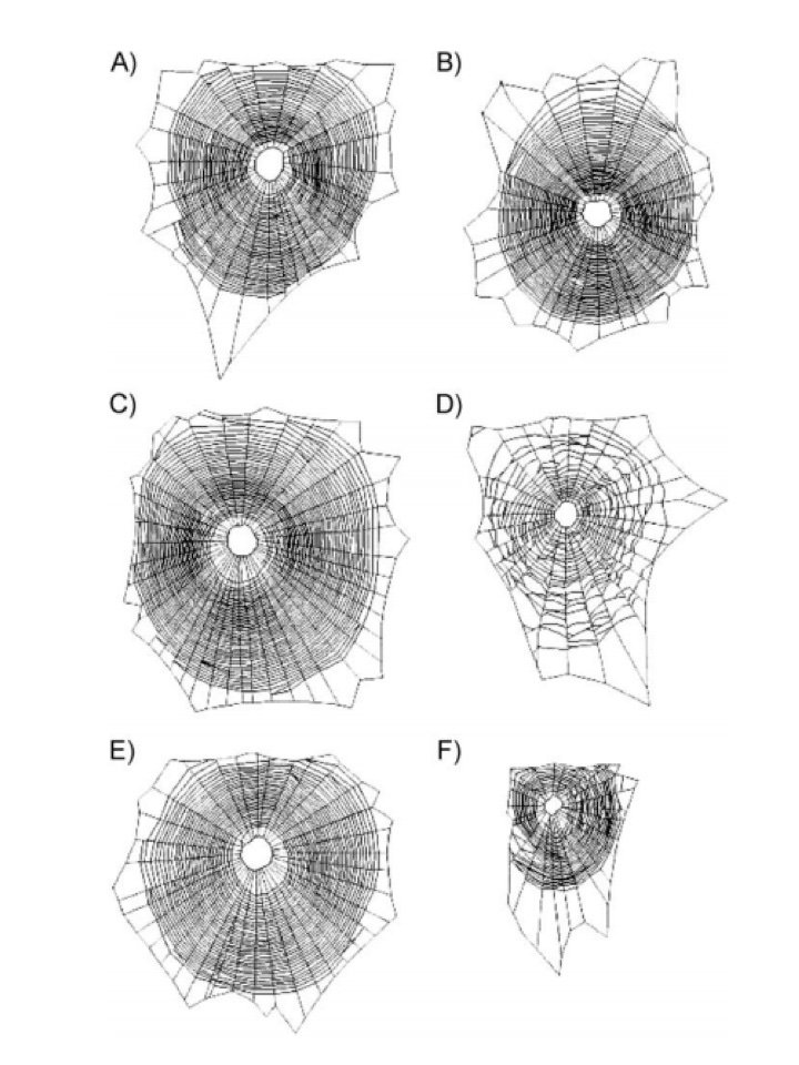 Observó que la anfetamina y la cafeína alteran la arquitectura de las telarañas pero de manera distinta. Afectadas por la anfetamina las telarañas mantienen su tamaño pero con irregularidad en el tamaño de los radios y las celdas.