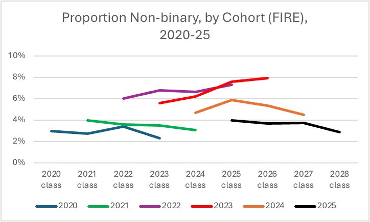 3: Além disso, os calouros em 2024-25 eram menos trans e queer do que os veteranos, enquanto o inverso ocorreu quando a identidade BTQ+ estava em alta em 2022-23.