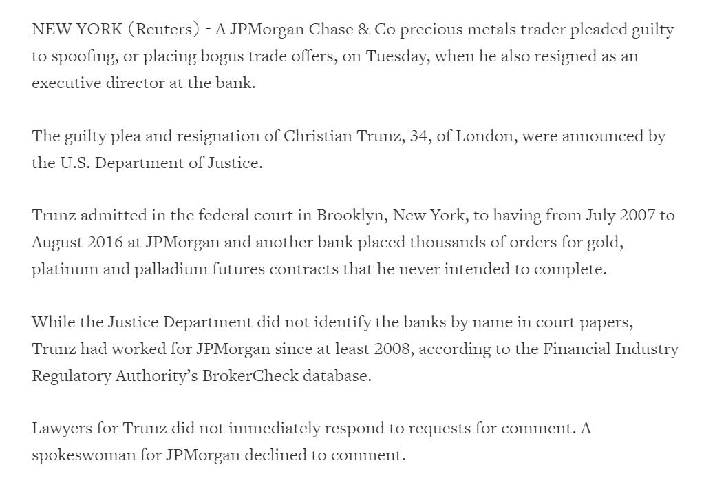 JP Morgan Executive Director Justin Trunz precious metals trader pleads guilty to conspiracy & agrees to cooperate in case for spoofing thousands of orders for gold, platinum & paladium from 2007-2016.