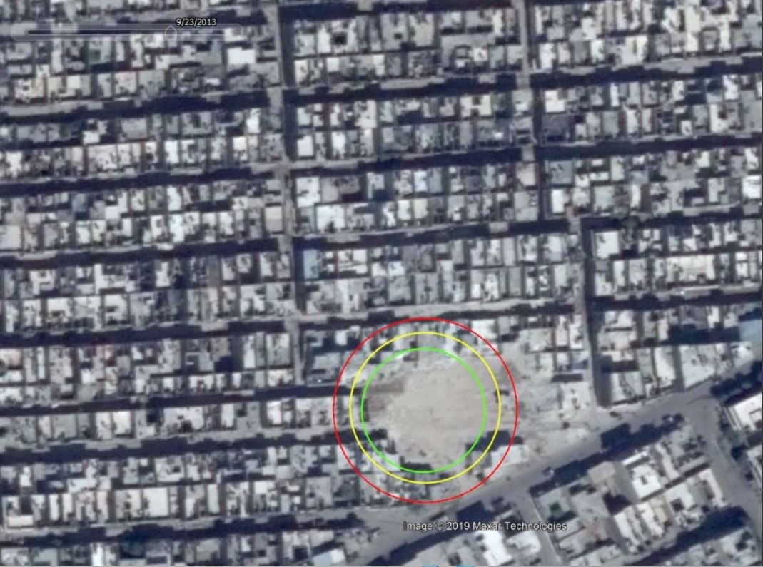 49-اما با جستجوهای بسیار در فیلم هایی که از شهر المیادین بعد از این واقعه پخش شد در فیلمی که چند ماه بعد توسط شبکه فعالان رسانه ای فرات پوست از شهر المیادین که حال در کنترل نیروهای دولتی سوریه و متحدانش قرار گرفته بود پخش شد می توان نگاهی به محدوده فوق داشت.