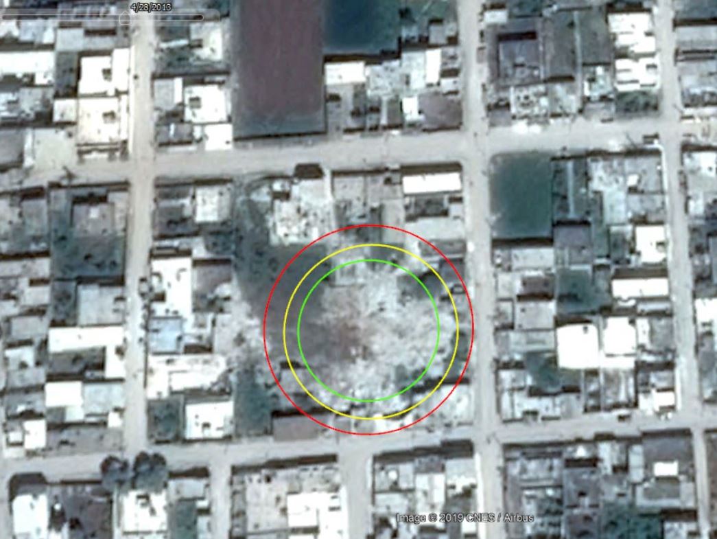 33-تصاویر ماهواره ای قبل از اصابت و بعد از اصابت و دایره های تخریب برای یک سر جنگی 750 کیلوگرمی (نزدیک به سر جنگی اسکاد B ) برای فشارهای 5PSI به رنگ قرمز ، 7PSI به رنگ زرد و 10PSI به رنگ سبز مشخص شده است.