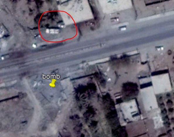 82-نکته جالب آن که در فیلمی که چند ماه بعد نیروهای دولتی سوریه و متحدانشان از داخل شهر نشان دادند نقطه آسیب دیده به همراه کامیون و خودروهایی که در تصویر ماهواره ای دیده می شوند (با دایره قرمز مشخص است) نیز دیده می شود.