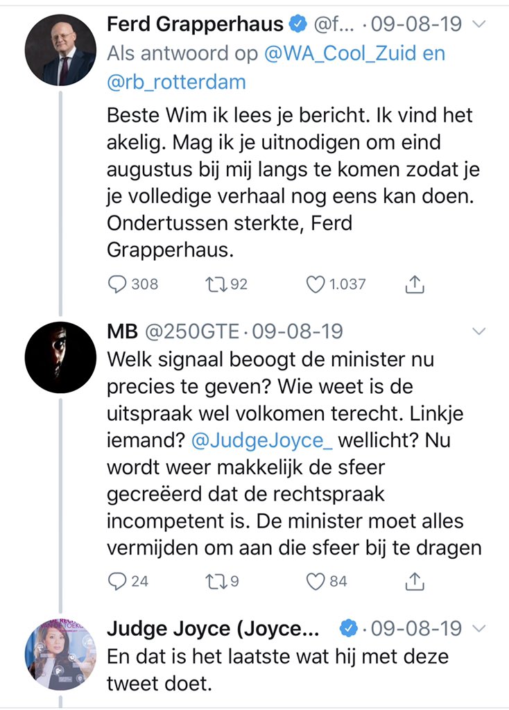 Grapperhaus ondermijnt met zijn tweet/uitnodiging de rechtspraak. Hij voer blind op de wijkagent en wachtte niet de feiten af. Let ook op het commentaar van ‘twitterrechter’ @JudgeJoyce_ . Zij twittert zich scheel aan uitspraken en is terecht boos als beeldvorming prevaleert.