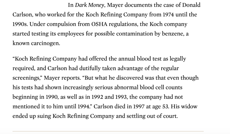 2. It's true that David Koch gave lots of money to cancer research. It's also true that Koch Industries, as @JaneMayerNYer documents in Dark Money, was fined for recklessly releasing carcinogens into the environment: