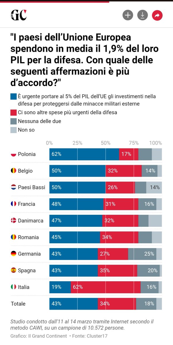 Sono molto contento della chiara DIVERSITÀ italiana che emerge dal sondaggio. L'Italia è il paese dell'Unione Europea nettamente meno militarista e incline alla pace.