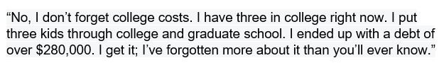 I looked up the video (c-span.org/video/?463586-…) because this tweet has been going around. Biden was talking about costs he says he incurred putting three kids through college, not debt for his *own* schooling.