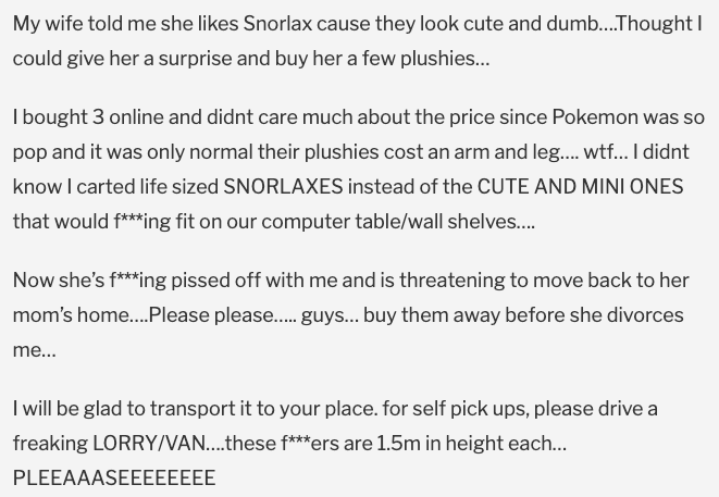 guy ordered snorlax plushies on Carousell to please his wife, forgot to check the size