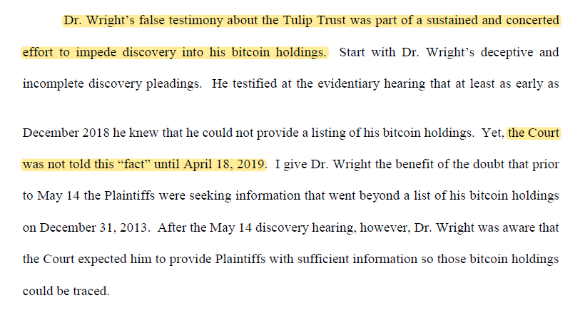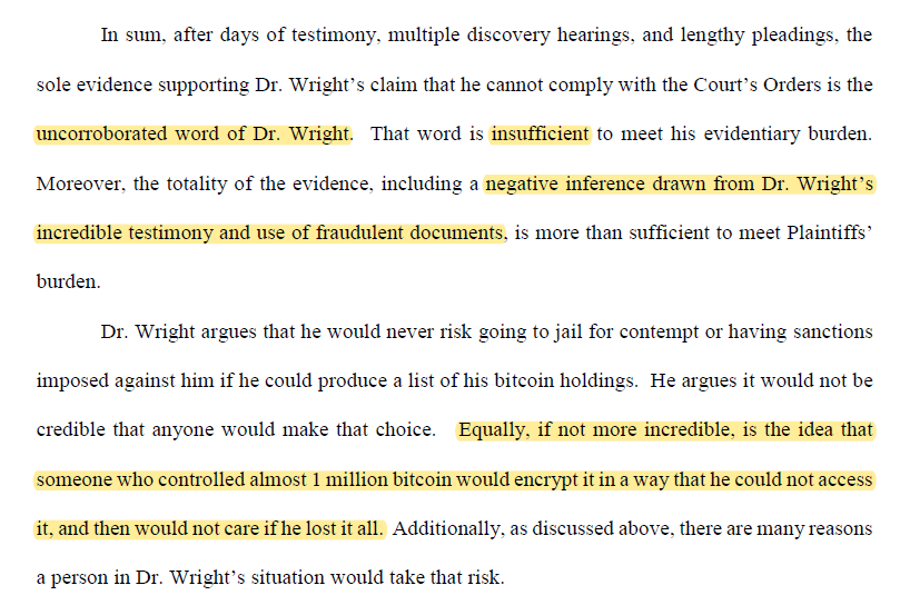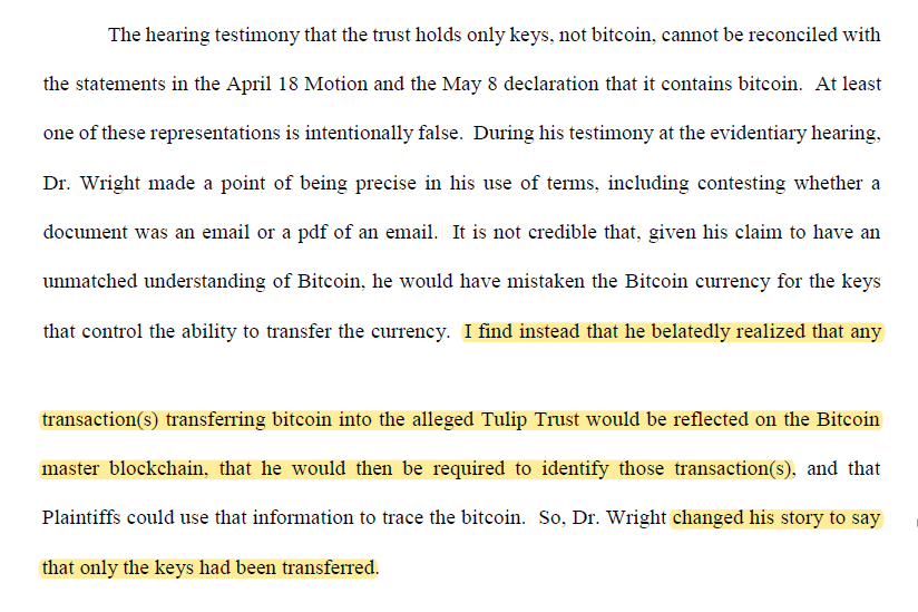 The judge takes CSW's bitcoin ownership claims at face value; those lies now only work to Wright's detriment, and the judge seems content to let Wright lie in the bed he made for himself.