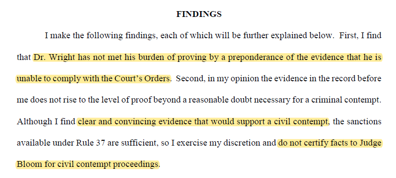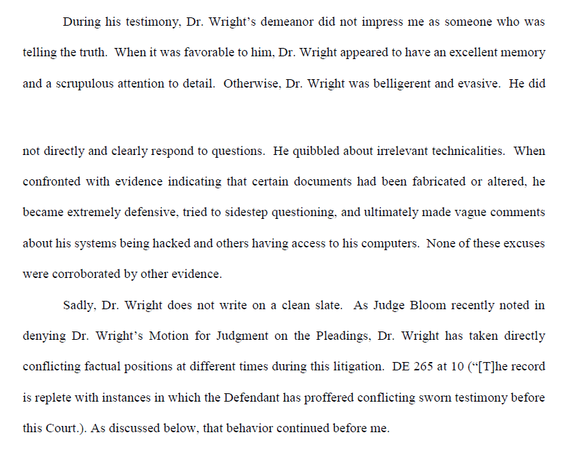 The judge tears into Wright's testimony and credibility in no uncertain terms, completely rejecting it. He agrees with Judge Bloom's recent finding that Wright is not credible.
