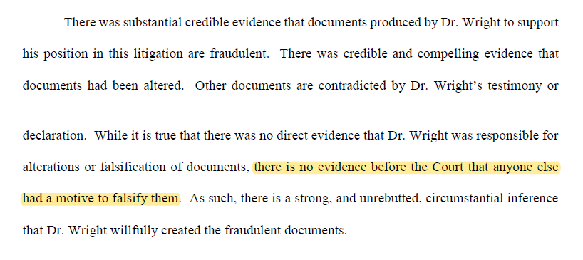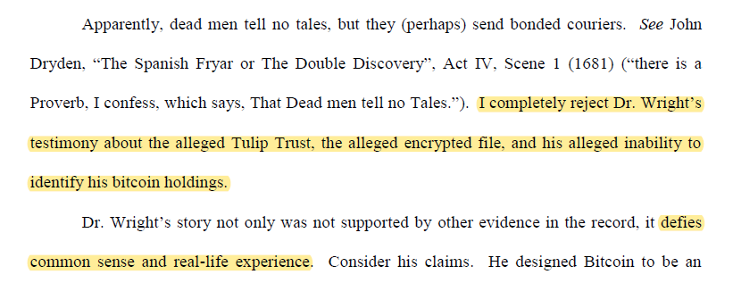 Judge's TL;DR: the defense's entire argument rests on Wright's word, which is beyond worthless. Someone like Wright *would* lie in court.