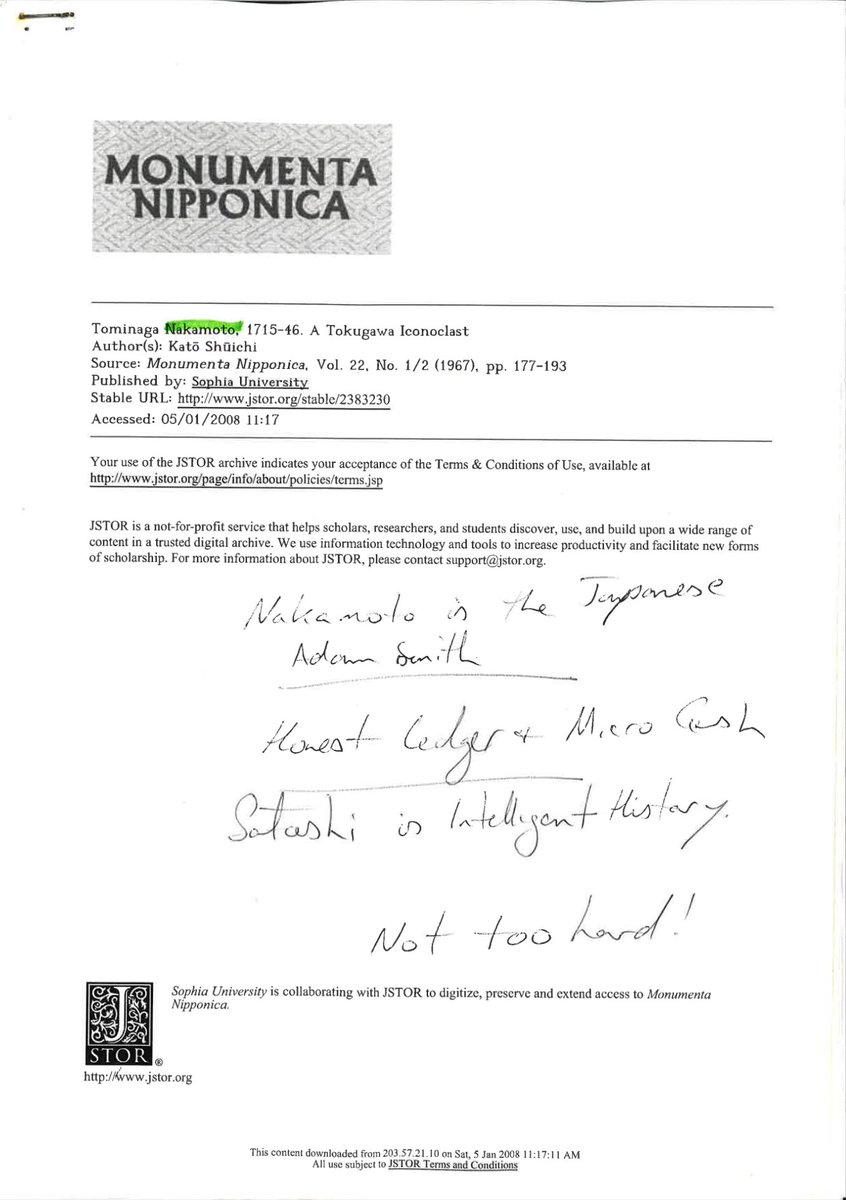 The JSTOR forgery didn't come from somebody else, and it isn't just some corrupted file. Wright was holding up this very document on camera, with his own handwriting on it, claiming it proved how he came up with the name Satoshi Nakamoto. This is *his* document.