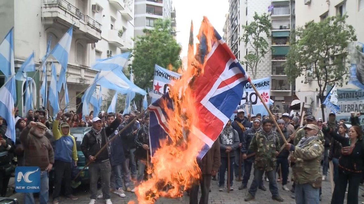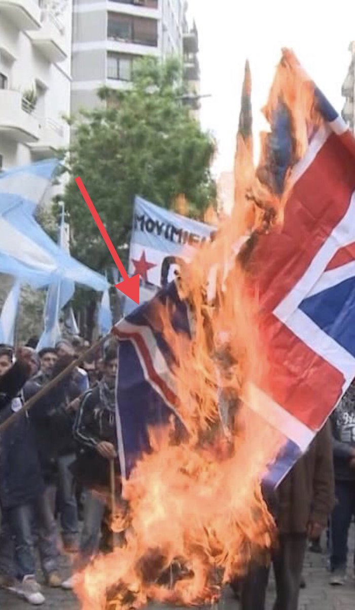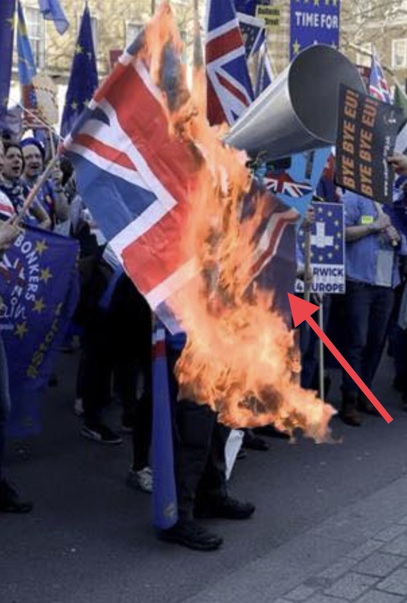 The burning UK flag is cut from an image taken at a demonstration in 2016 outside the British Embassy in Buenos Aires, it’s been reversed and then photoshopped onto the EU protest in London.