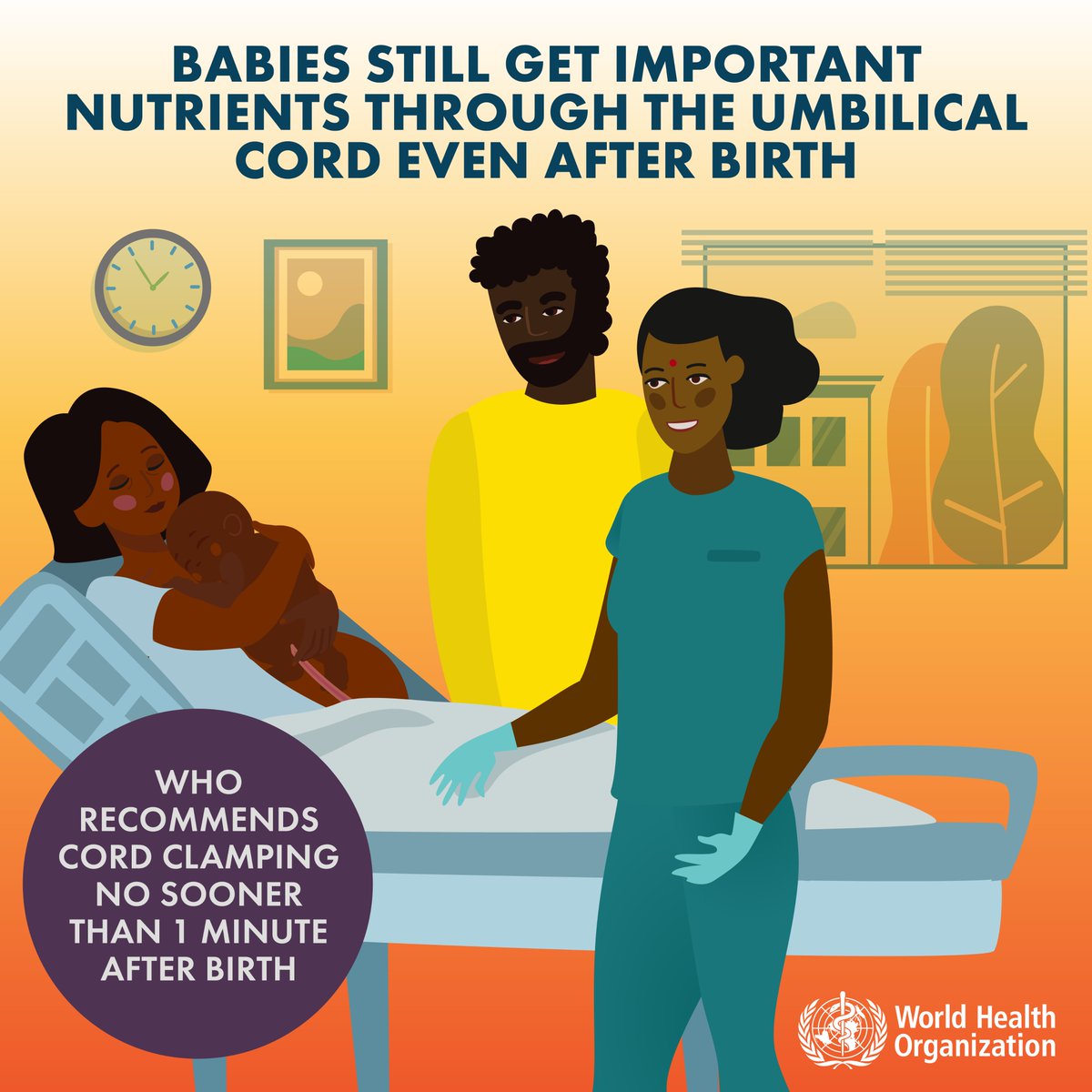 WHO recommends cord clamping no sooner than 1 minute after birth