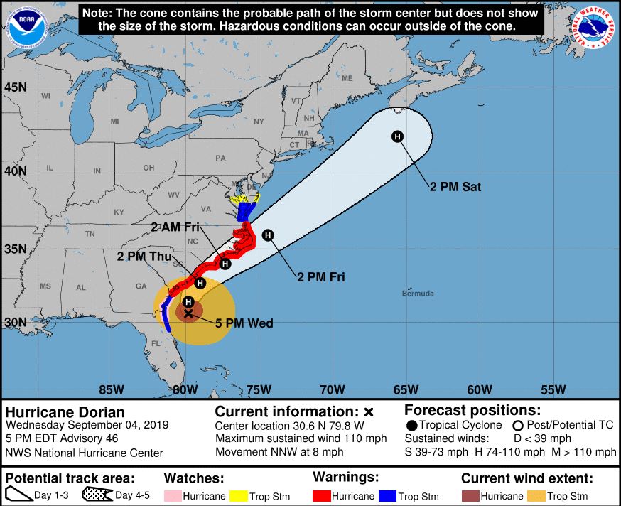 • Dorian strengthens slightly as a Cat. 2 now with 110 mph winds