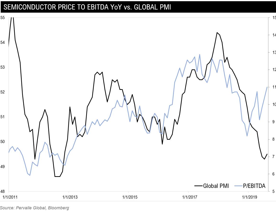 Where should we trade? Based on the historical relationship between P/EBITDA and the global PMI -- roughly 7x vs. 11x currently. This is a 36% haircut.