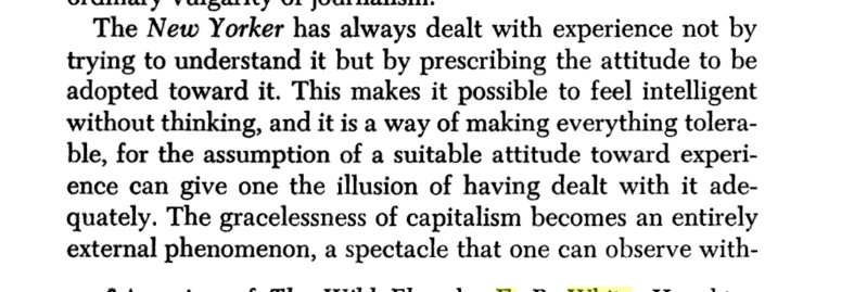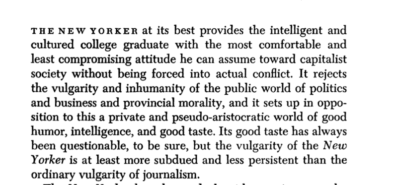 5. Via E.B. White, genteel, small-town tree-hugging liberalism has always been a part of the New Yorker's DNA. Robert Warshow, reviewing a White book in 1947, provided a devastating critique.
