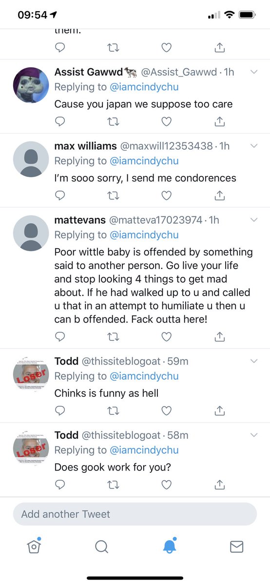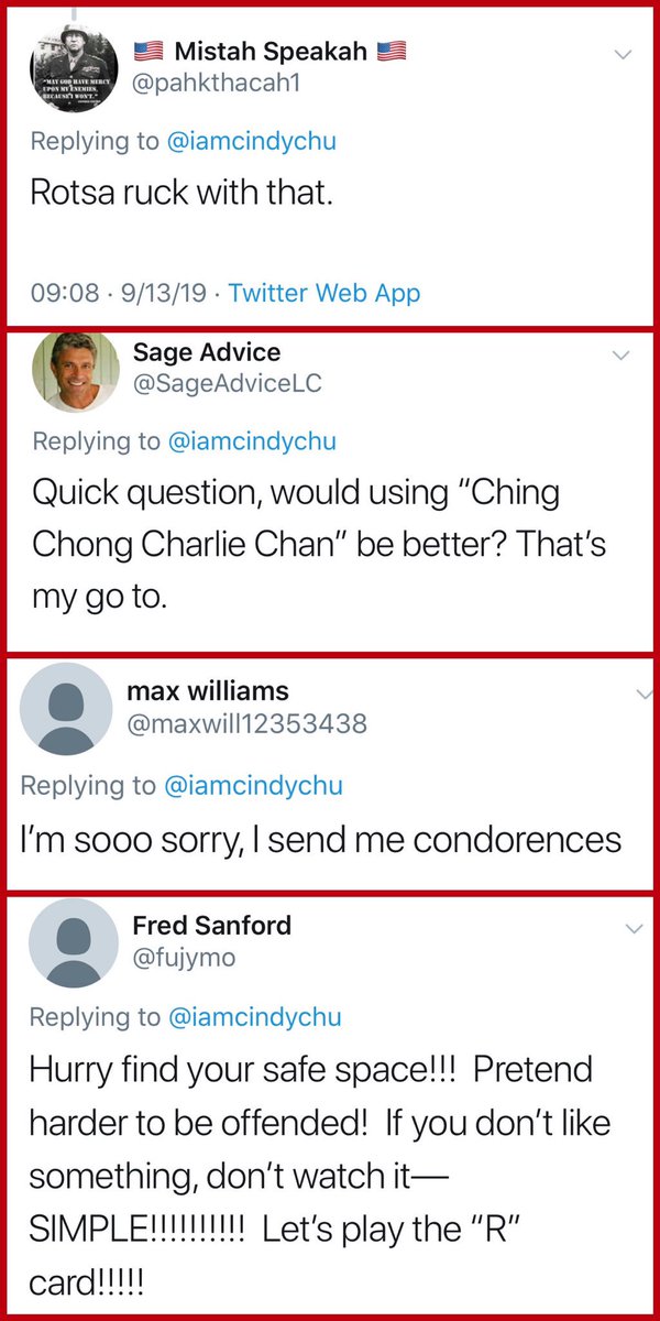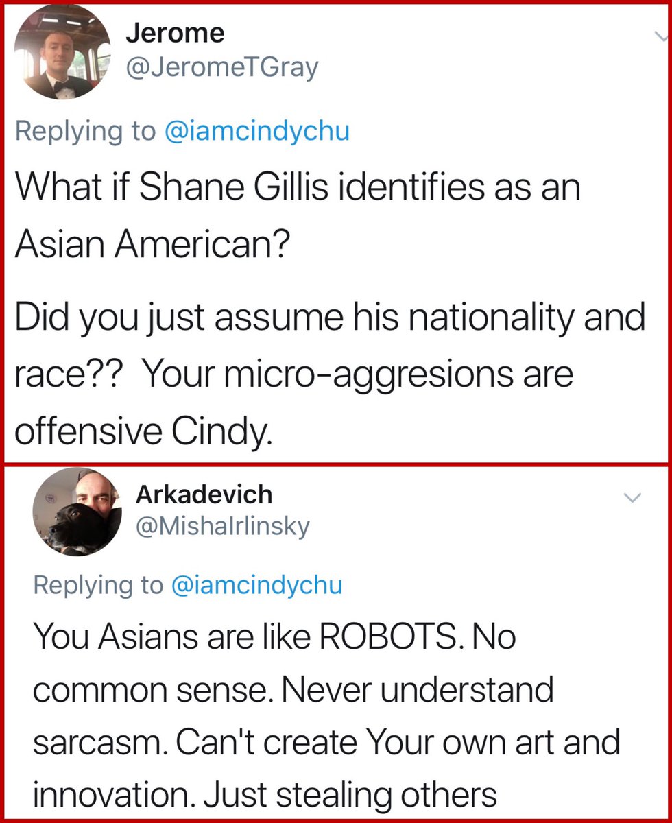 Wow, so many fans of racist slurs using the SAME tired, unoriginal concepts. Clever! One of these guys is a life coach?! Also, does the last guy not realize the Chinese invented the printing press, paper, gunpowder, & compass? But sure, use dehumanizing language & call us robots.