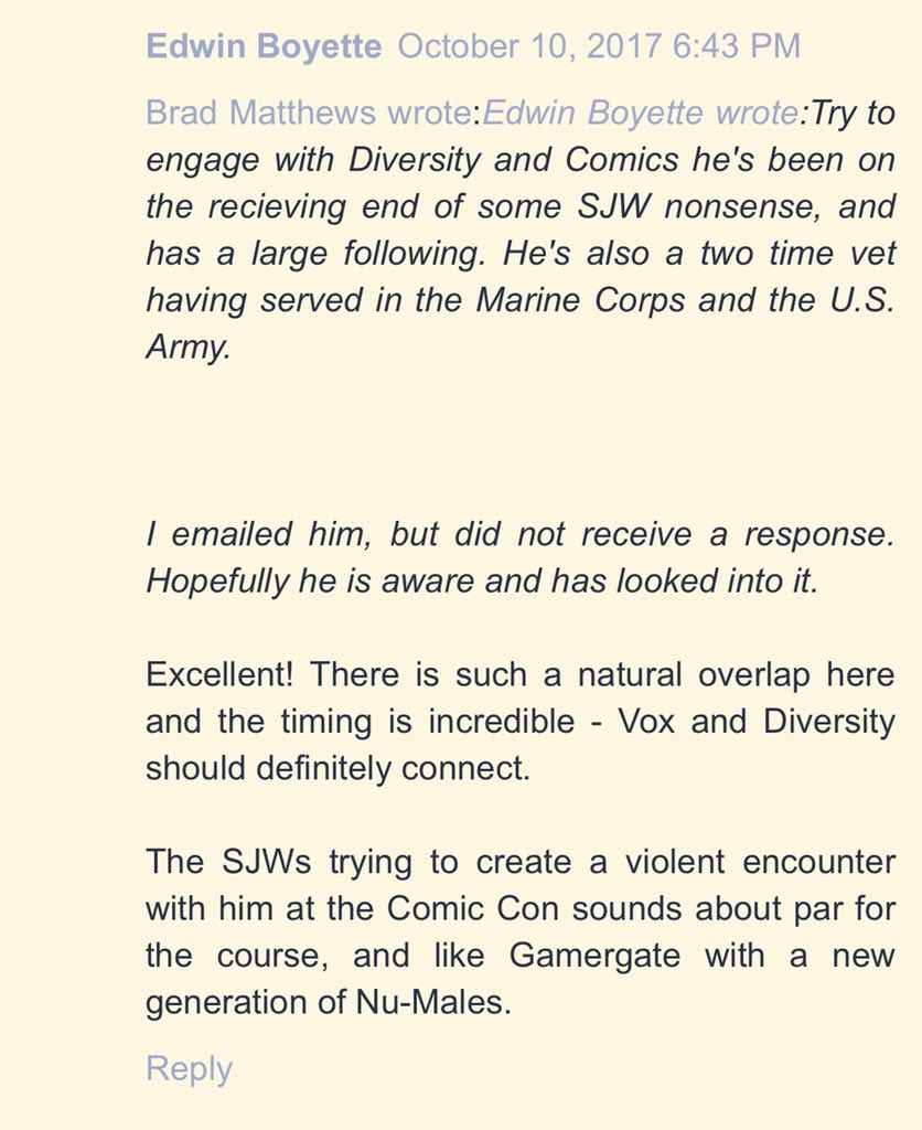 Here he is encouraging Vox to try and weasel closer to Richard C. Meyer. Same Vox Day who supports terrorist Anders Brevijk.