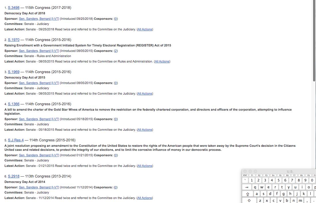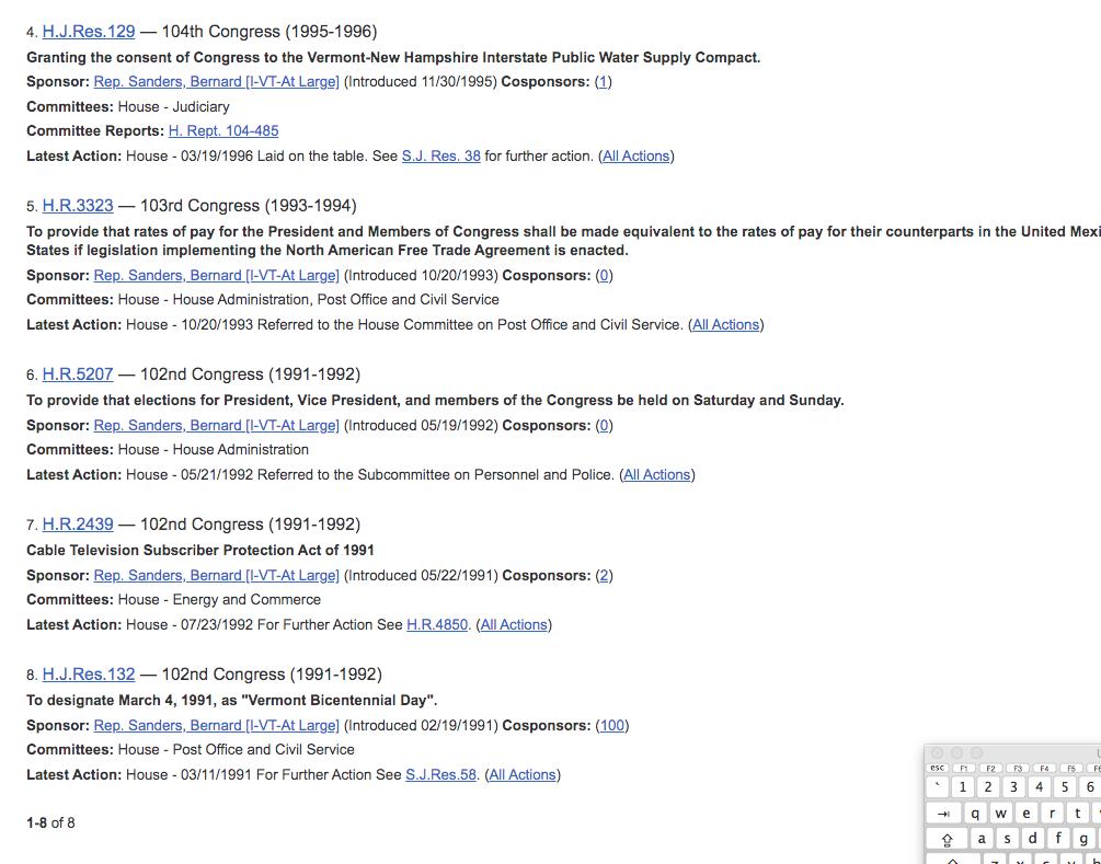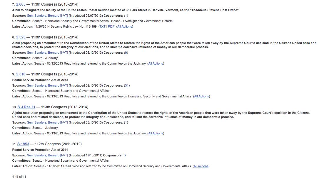 and his House record is empty except for a bill to move elections to the weekend. Needless to say, nothing became law because no bill Bernie introduced became law (well, naming post offices) because he is ineffective