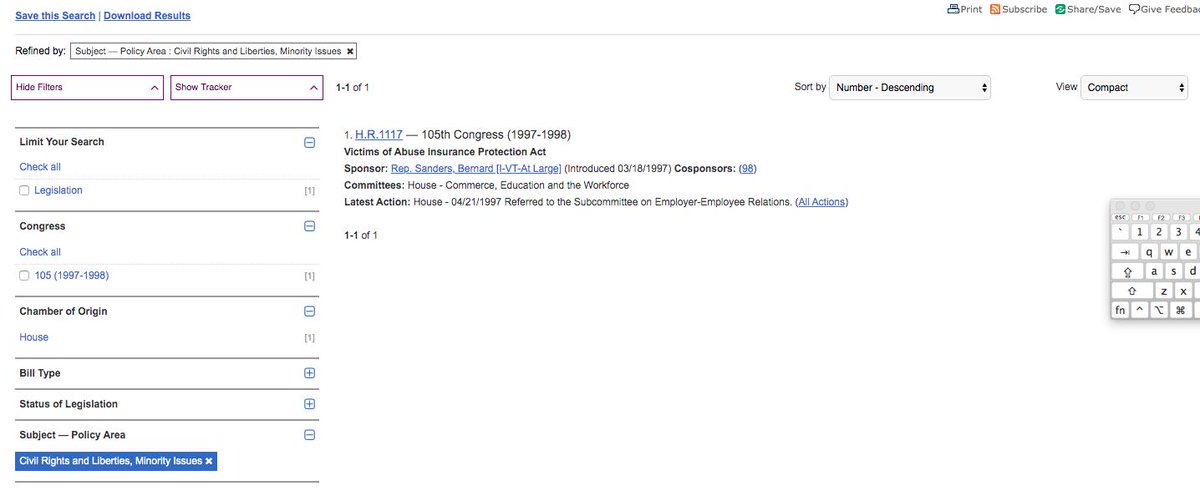 In all his years in the House of Representatives, Bernie Sanders introduced on bill that falls into the Civil Rights subject line - prohibiting discrimination of victims of abuse. It did not become law. ONE BILL