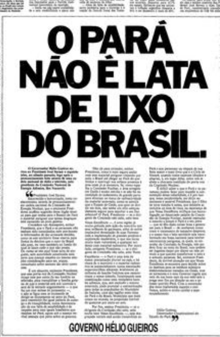 fora escolhido como a lixeira do país. Publicou na imprensa nacional carta aberta ao Presidente da República, José Sarney, afirmando que "O Pará não é lata de lixo do Brasil" e elencou outros 10 possíveis lugares apropriados para o despejo do material. Image