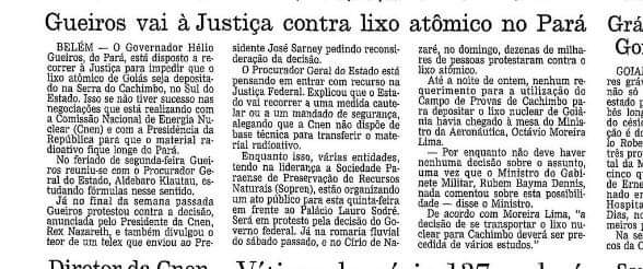 Ao mesmo tempo em que deixava que fosse conhecida a sua posição política, o Governo do Pará iniciou um processo de consultas destinado a barrar, na Justiça, a decisão de enviar o lixo atômico de Goiânia. Iniciou-se, então, uma verdadeira "queda de braço" entre Belém e Brasília, Image