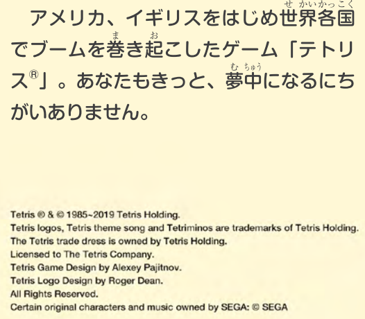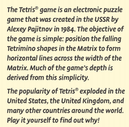 I feel like the text is a bit more plain. Instead of something like "Tetris is a puzzle game developed by a researcher working at the Soviet 'Academy Computer Center,'" the backstory gets simplified down. It also doesn't define terms like Tetrimino or Matrix, they're just there.