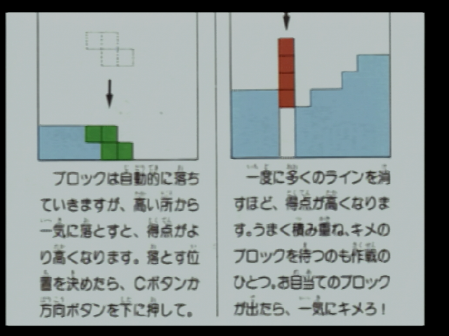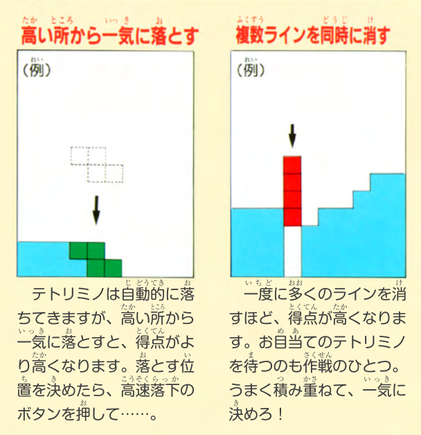 The section about drop scoring is also interesting; the original manual doesn't have the 高速落下のボタン terminology, referring only to the "C Button."