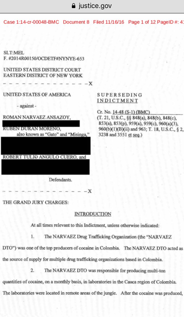“According to the indictment, Narvaez was a founder and principal leader of a drug trafficking organization in Colombia responsible for producing multi-ton quantities of cocaine, on a monthly basis, in jungle laboratories in the Cauca...